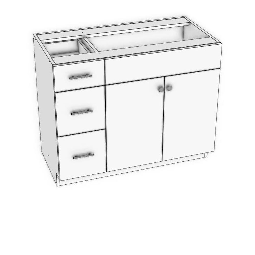 42" width x 21 3/4" depth x 34 1/2" height vanity sink cabinet with 3 drawers on the left side, pair of doors and a false front